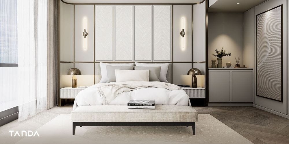 ห้องนอนเรียบหรูดูแพงเริ่มจากผนังโทนเรียบ เฟอร์นิเจอร์น้อยชิ้น ไฟซ่อนโทน Warm Light หัวเตียงสูงหุ้มผ้า ผ้าม่านเต็มผนัง พื้นห้องโทนอ่อน ไม้ธรรมชาติ และของตกแต่งที่มีคุณภาพ เพราะเมื่อทุกอย่างถูกจัดวางอย่างลงตัว ห้องนอนก็จะกลายเป็นพื้นที่พักผ่อนที่อยู่ได้อย่างสบายใจ